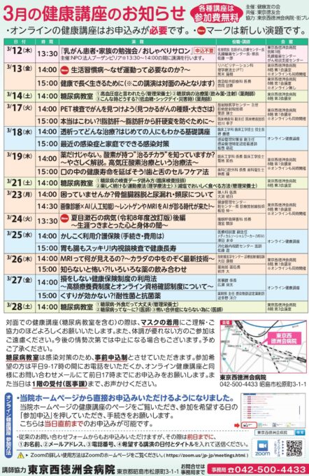 主催:健康友の会 共催:東京徳友会 協力:東京西徳洲会病院・街プレ各種講座は参加費無料申し込み不要です。