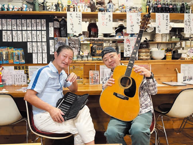 ライブも始まった。なぎら健壱さん、古井戸の加奈崎芳太郎さん、キャロルの内海利勝さんらそうそうたるメンバーもステージに立った。内海さんのバンド仲間、ブルースハーモニカ奏者の石川彌八郎さんとは石川さんの義姉が縁になった。「2回ほどミニライブを開いたかな」と石川さん。昔話が始まれば喉を潤したくなる。日本酒を頼むと、「多満自慢」がアルマイトの急須で提供された。