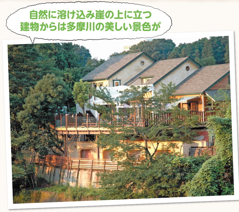 カフェは友田橋、アーチ型の友田水管橋が架かる多摩川上流左岸、流れが瀞のように緩やかになる崖の上に建つ。自然に溶け込んだ建物は、オーナーが建築を生業としているだけあって外観的にも内装的にも楽しめる。店のそこかしこに芸術的な香りを感じられるのもうれしい。