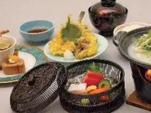季節の天ぷら盛り合わせ、鮮魚のお刺身、季節の焜炉(こんろ)料理が付いた盛りだくさんな内容。特選デザートは、清水牧場「WESTLAND FARM」(瑞穂町)の「しぼりたてミルク」ジェラートを用意した。