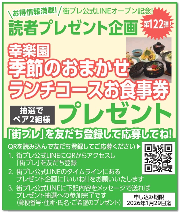 幸楽園 季節のおまかせランチコースお食事券 抽選でペア2組様プレゼント