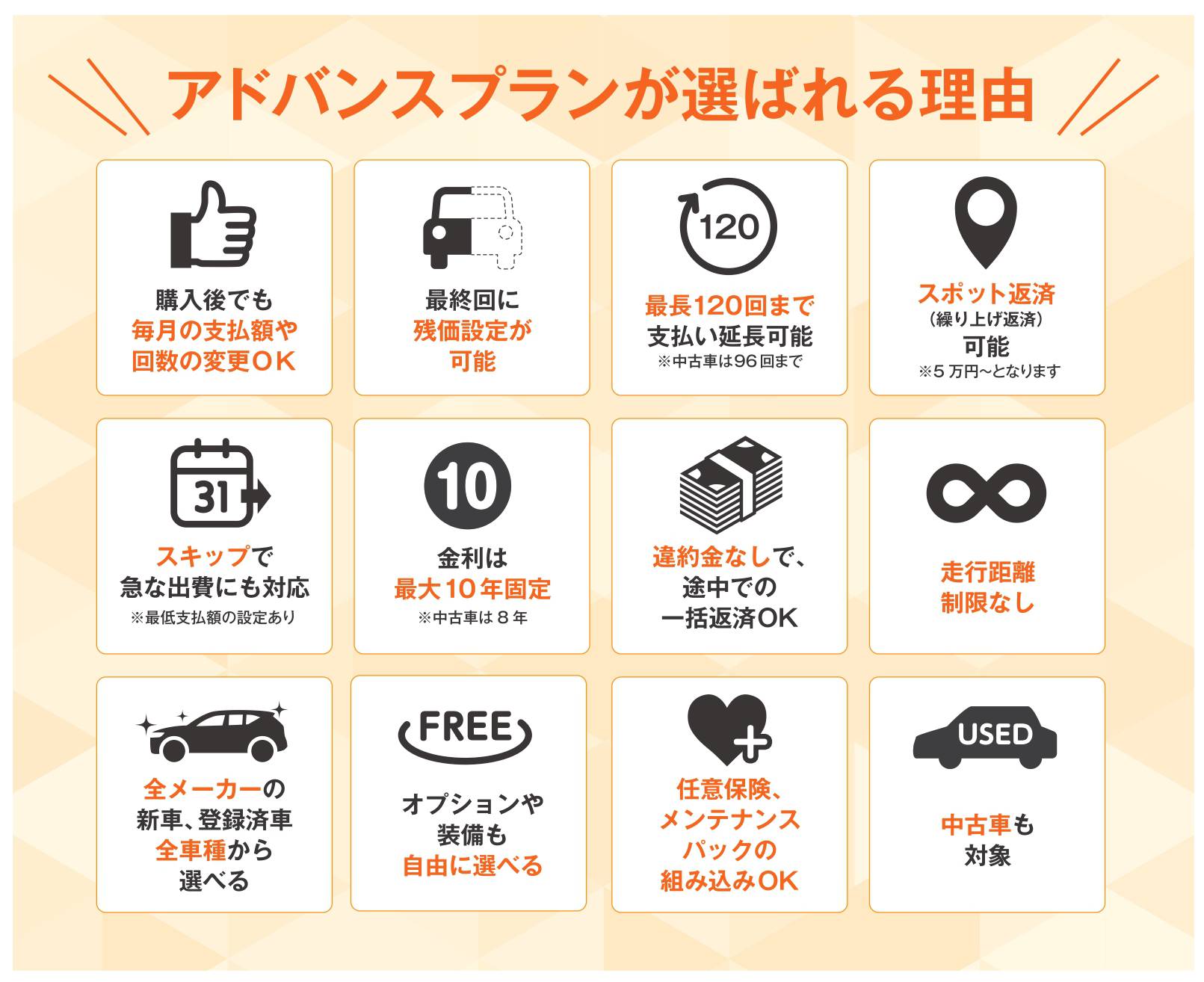オニキス羽村中央店(羽村市栄町)の「アドバンスプラン」は、消費者ニーズに応え、新車・未使用車・中古車全てに適応。また月々の支払額も後から変更できるため、ライフスタイルの変化に合わせて設定できる。同店でローンを組む来店者の約9割が利用するお得なサービスだ。