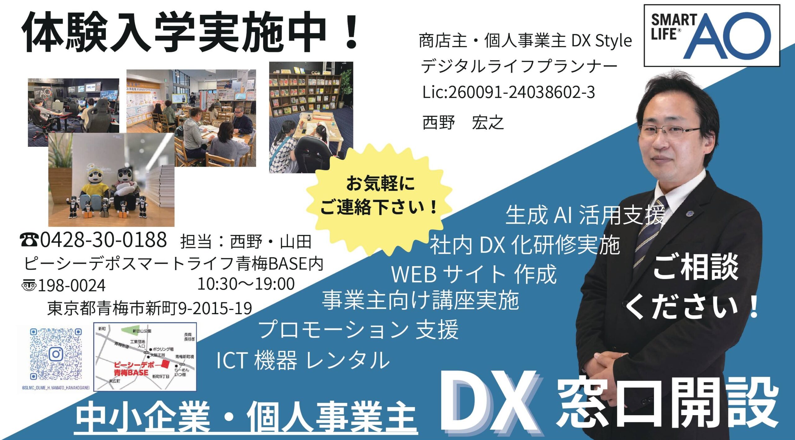 ピーシーデポスマートライフAO東京青梅校(青梅市新町)は、商店主・個人事業主DX学部を新設した。現在、体験入学を実施中。商店主、個人事業主のDX(デジタルトランスフォーメーション)化とくらしを応援していく。