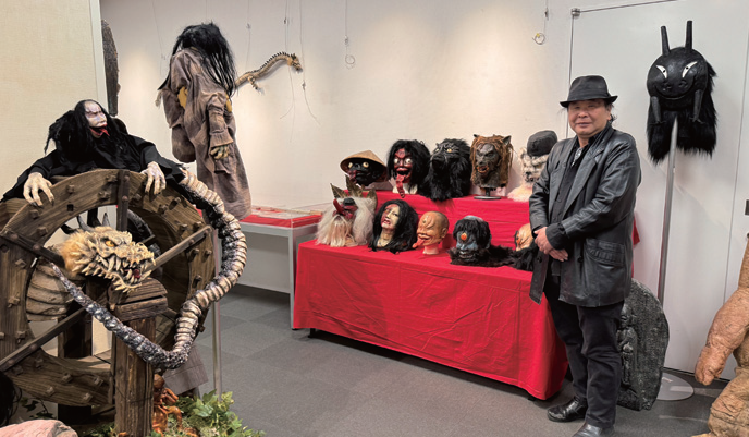妖怪は、フリーの特撮造形師として活躍し、飯能市内で河童洞を運営する杉本末男さんが製作した=写真。日高市に由来する血取りという妖怪は目が合うと「背中がゾクッとする」迫力があるという。杉本さんは日本を代表する伝統的な特撮造形師で、晩年まで瑞穂町で創作活動を続けた村瀬継蔵さんの技を受け継ぐ。