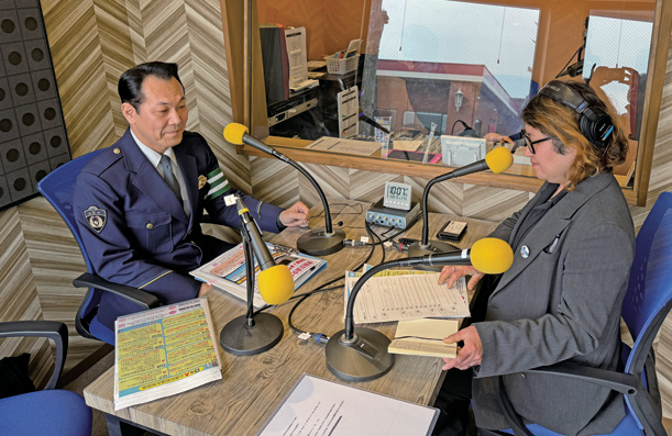 春の全国交通安全運動は4月6日〜15日に実施。4月1日には16歳以上が運転する自転車の違反に対し交通反則通告制度(青切符)が導入された。同署では周知徹底に努めており、3月30日には薫田亨交通課長が「HelloFM」(福生市福生)に出演し、同制度について説明した=写真。自転車の交通ルールは変わらないが、信号無視などの明らかな違反行為を行ったときに取り締まりを受ける。交通反則告知書を出されると反則金を納付する必要があるなどと話し、「一層の交通安全を心がけてほしい」と訴えた。