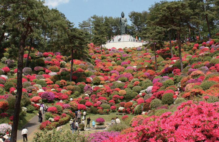 もともと境内の裏山にヤマツツジが自生していたことから、1965(昭和40)年に「つつじ園」の構想が計画され、翌年、ツツジの植栽が始まった。1967(昭和42)年に「第1回つつじまつり」を開催。年々整備が進み、2010(平成22)年の「開創1350年祭」で塩船平和観音立像が「つつじ園」の頂上に落慶し、現在の姿になった。