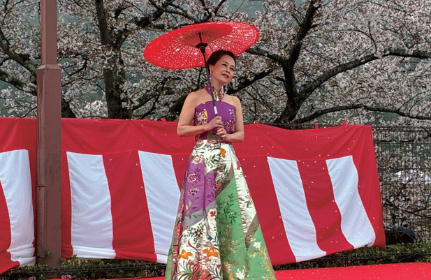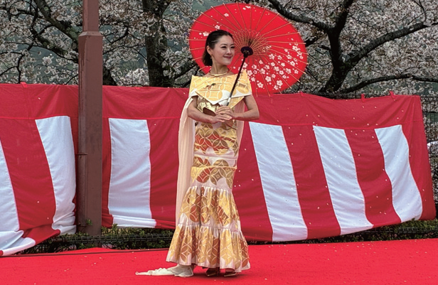 羽村の親水公園(羽村市羽中)で開催中の「はむら花と水のまつり」のステージで4月4日、「かんざしJAPAN」の着物リメークドレスショーが開かれた。サクラとチューリップが咲く会場も、この時間ばかりは美しい和の世界に魅了された。